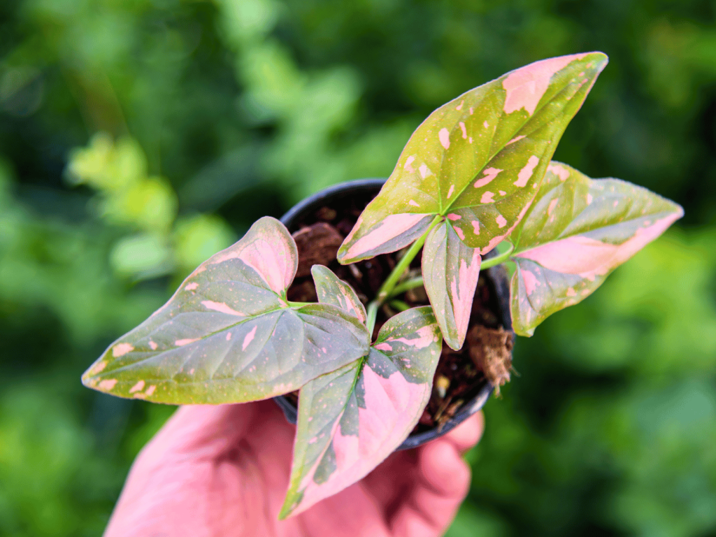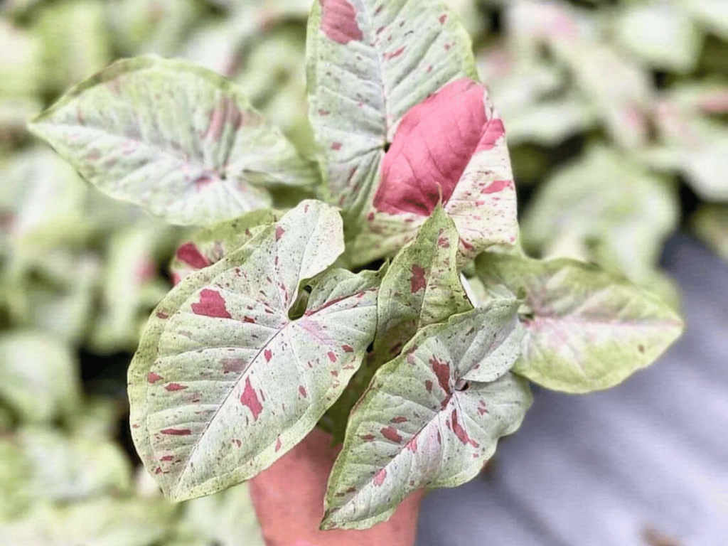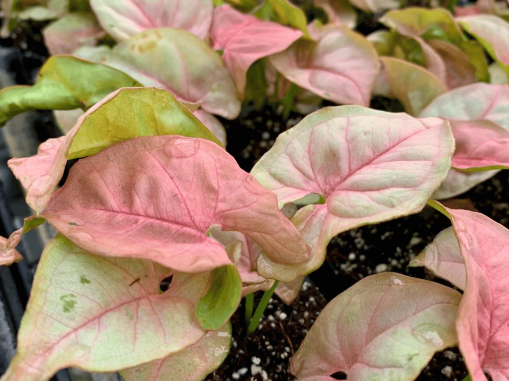 Syngonium ‘Milk Confetti’ – listovi svijetlozelene boje s ružičastim pjegama, vrlo dekorativna varijanta za svaki dom.