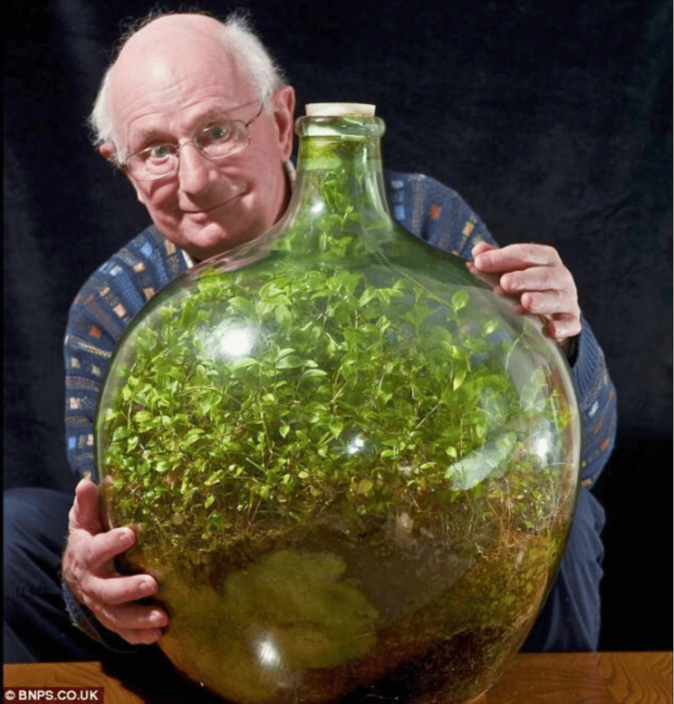 David Latimer, tada 27-godišnji inženjer iz Surreya, odlučio je napraviti mali pokus iz znatiželje. U veliku staklenu bocu od 38 litara nasuo je malo zemlje, posadio Tradescantiu (poznatu i kao “Spiderwort”), dodao kap vode — i zatvorio bocu plutenim čepom.